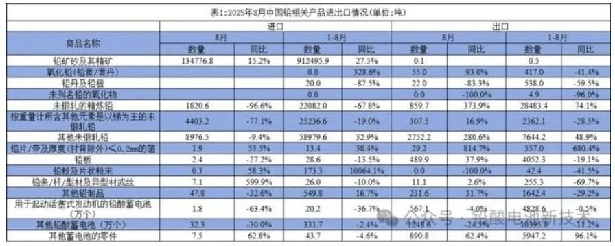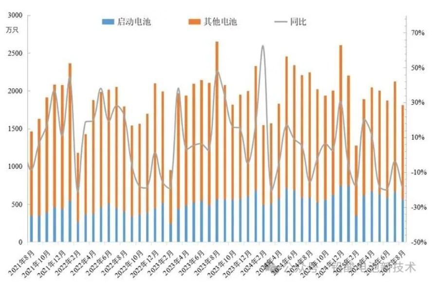 2025年1-8月,中国累计出口铅蓄电池15248.7万个,同比下降7.8%。同期,铅蓄电池累计进口量为351.9万个,同比下降5.3%。1-8月累计净出口铅蓄电池14896.9万个,同比下降7.9%,降幅较1-7月扩大1.7个百分点。