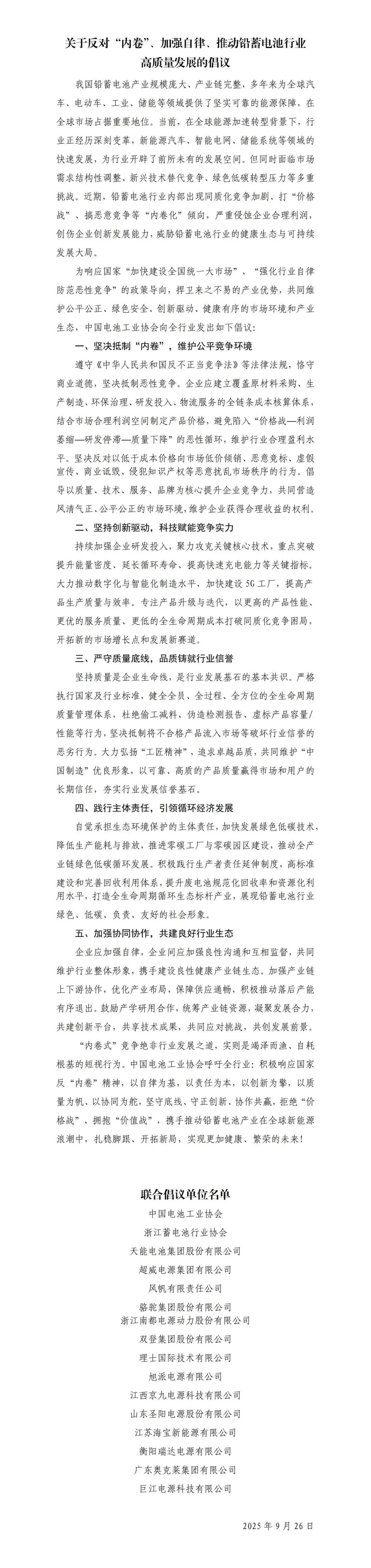 为积极响应国家关于推动产业高质量发展的号召,有效应对行业当前面临的发展挑战,凝聚行业共识、破解发展难题,2025年9月26日,铅蓄电池行业反内卷工作会议顺利召开。会议邀请了浙江蓄电池行业协会以及天能、超威、风帆、骆驼、双登、理士、旭派、南都、京九、圣阳、海宝、瑞达、奥克莱、巨江等国内重点铅蓄电池企业主要负责人,重点围绕行业健康发展议题展开深入交流。中国电池工业协会理事长刘宝生、副理事长马德军参加会议,会议由中国电池工业协会副理事长兼执行秘书长王建新主持。